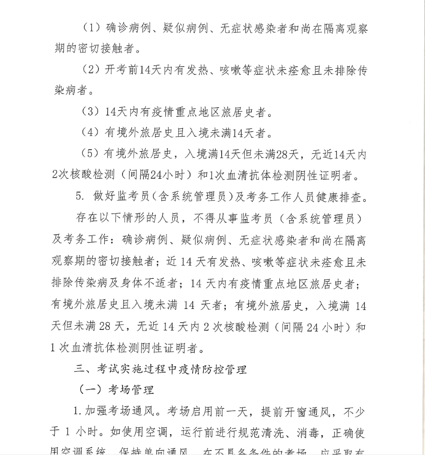 (3)屬于以下情形的,不得參加考試:①確診病例、疑似病例、無癥狀感染者和尚在隔離觀察期的密切接觸者;②開考前14天內(nèi)有發(fā)熱、咳嗽等癥狀未痊愈且未排除傳染病者;③14天內(nèi)有疫情重點(diǎn)地區(qū)旅居史者;④有境外旅居史且入境未滿14天者;⑤有境外旅居史且入境滿14天但未滿28天,無近14天內(nèi)2次核酸檢測(cè)(間隔24小時(shí))和1次血清抗體檢測(cè)陰性證明者。